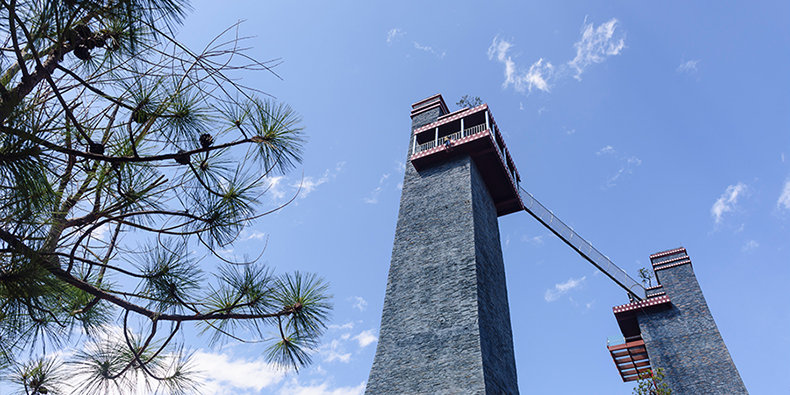 兩座碉樓之間有"同心橋"相通,猶如天上的一座鵲橋,橋體高懸空中,伴隨著你的腳步搖蕩,相愛的人只有同心攜手才能挑戰(zhàn)通過。