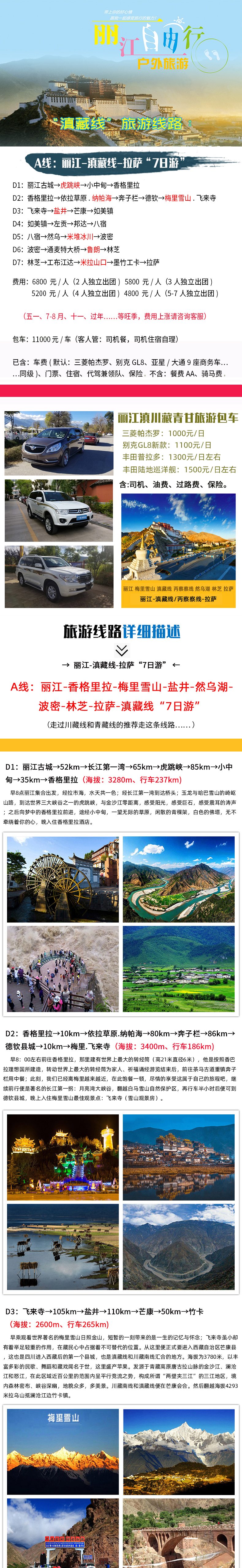 一條路線就把滇西北地區(qū)和滇藏、川藏南線都走完了 。處于世界屋脊的中國西藏,被許多人視為神秘的地方。西藏以其雄偉壯闊、神奇瑰麗著稱寰宇。她有著悠久的歷史、壯麗的河山、奇特的民族風(fēng)情、仙境般的自然景觀。這里星羅棋布的高原湖泊清澈湛藍(lán),平滑如鏡。若仙子般靜謐而又神秘;她遍布巍巍聳立的雪峰、終年不化的冰川;這里、清澈的天空藍(lán)得像藍(lán)寶石一樣令人心醉;飄渺優(yōu)雅的白云如潔白的哈達(dá)時(shí)常靜靜地環(huán)繞在高聳的山半腰,仿佛伸手可及、給人一種置身天國的無窮暇想。而那蒼涼狀美的自然風(fēng)光、清新沁人的純凈空氣、沉寂安祥的茫茫戈壁、牛羊成群的千里草原、青稞飄香的金色河谷、郁郁蔥蔥的原始森林、濃郁淳樸的民族風(fēng)情、金碧輝煌的千年古剎,使西藏高原成為中外旅游者夢縈魂繞的情結(jié)、佛教徒心目中永遠(yuǎn)的凈土和圣地。